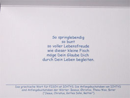 Die links abgebildete doppelseitige Karte mit Umschlag ist eine schöne Ergänzung zum Tauffisch-Bild. Auf der Innenseite ist der folgende Text zu finden: